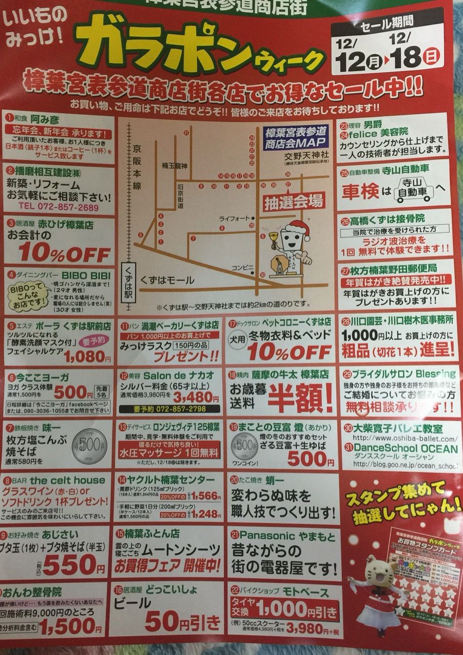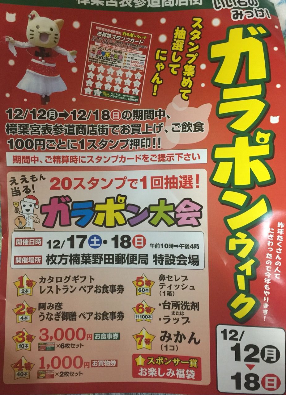 #樟葉宮表参道商店街 でお買い上げ、ご飲食100円ごとに1スタンプ 20スタンプで1回抽選